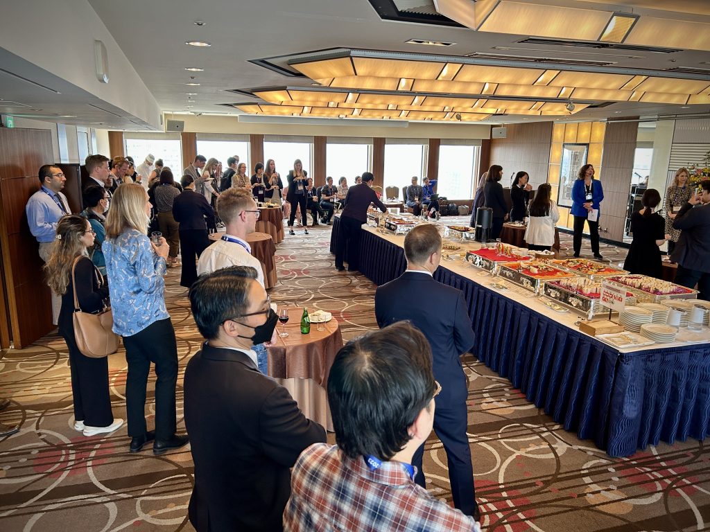 Nu står vi omsider klar i et pompøst lokale med et stormønstret gulvtæppe, som man kun ser dem i store mødelokaler og konferencecentre, på 30. etage med udsigt til Tokyos skyline og med alt fra gullasch til sushi på snackbuffeten.