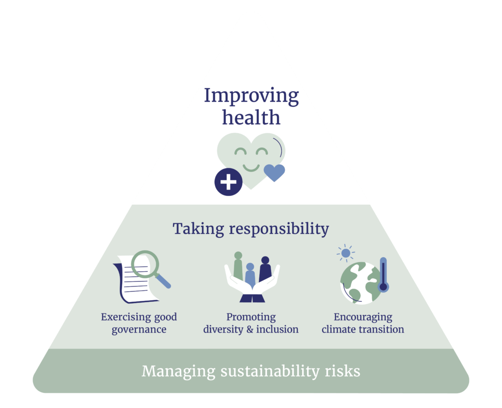 In addition to improving health, we also aim to contribute to sustainable development by taking responsibility and promoting good environmental, social and governance (ESG) practices.