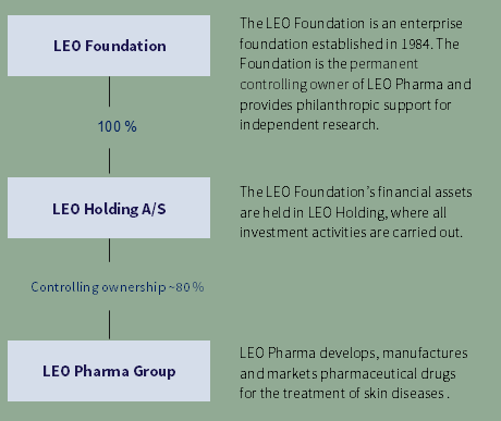 The LEO Foundation has established a wholly owned subsidiary, LEO Holding A/S, to manage the Foundation’s investment activities, incl. the ownership of LEO Pharma. LEO Holding is governed by the same Board and Executive Management as the LEO Foundation.